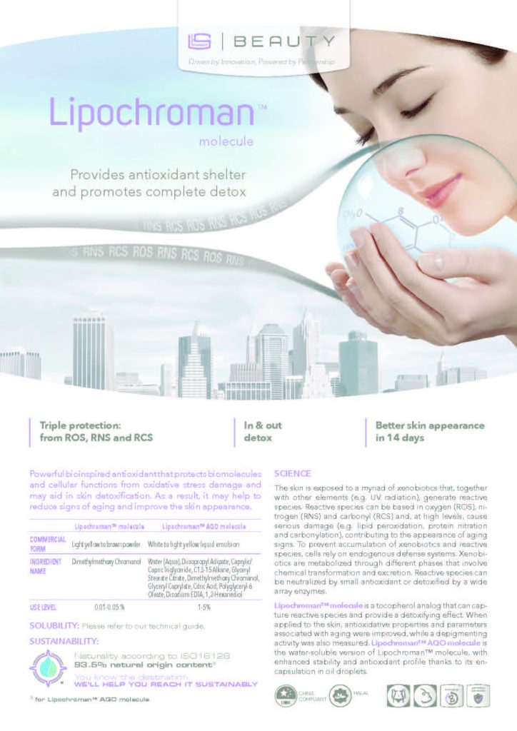 An active shelter against pollution This vitamin E-like molecule offers a triple protection effect by capturing and eliminating three types of free radicals in the skin: ROS, RNS and RCS. It also promotes the skin detoxification processes for anti-aging and skin tone improvements. Water soluble version of Lipochroman™ molecule. Naturality according to ISO 16128 – 93.45% natural origin content.
